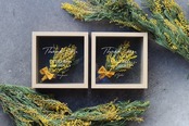 木枠の中に小さなミモザのドライフラワーブーケを残しました。